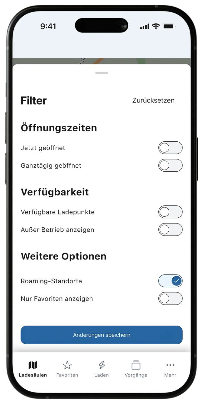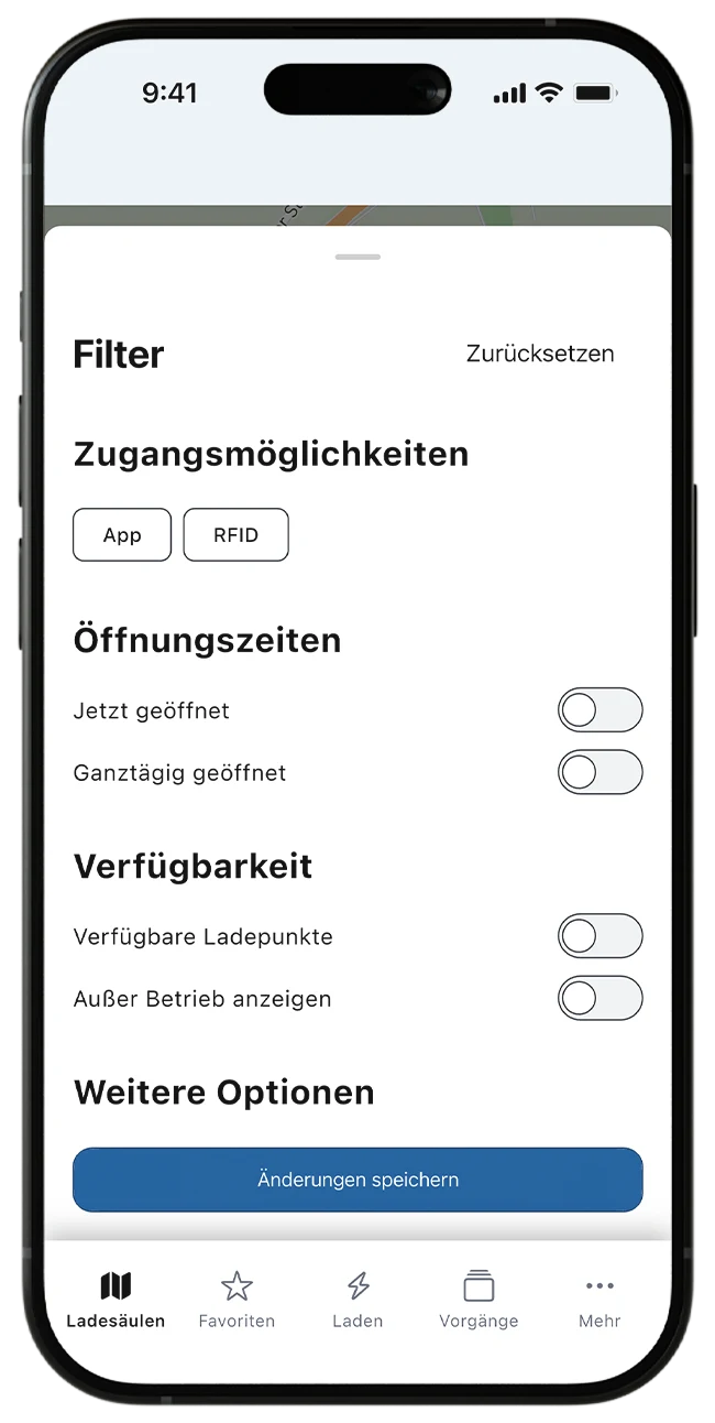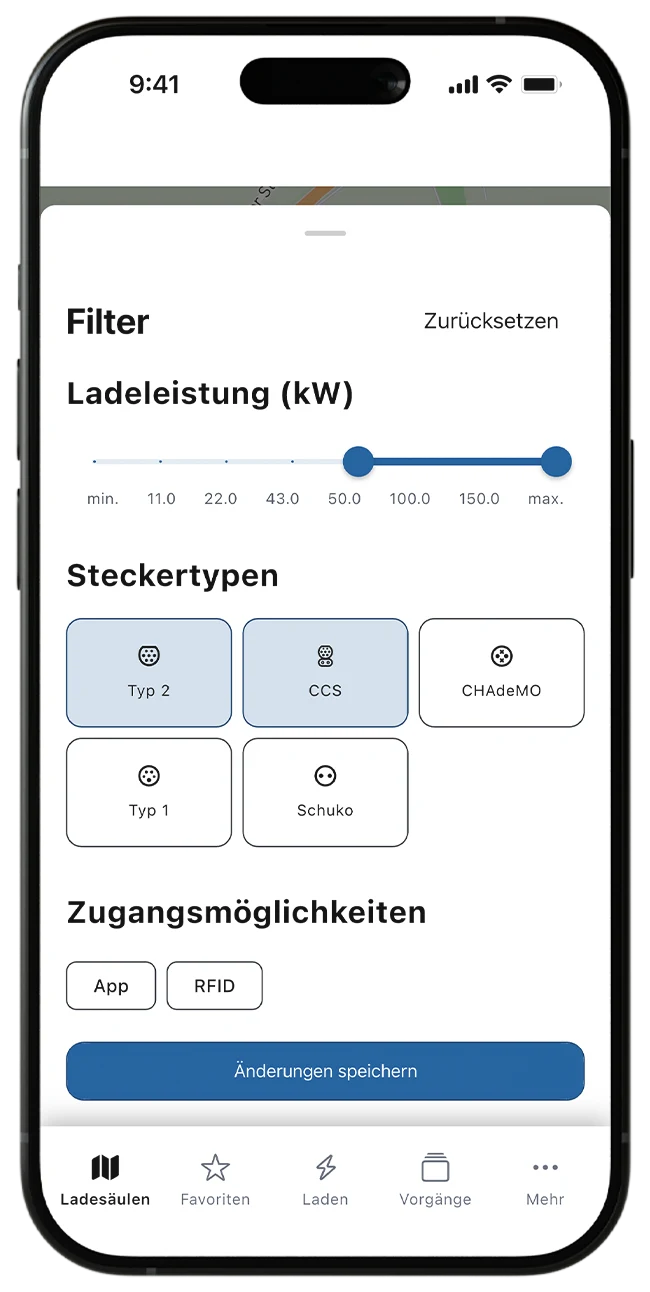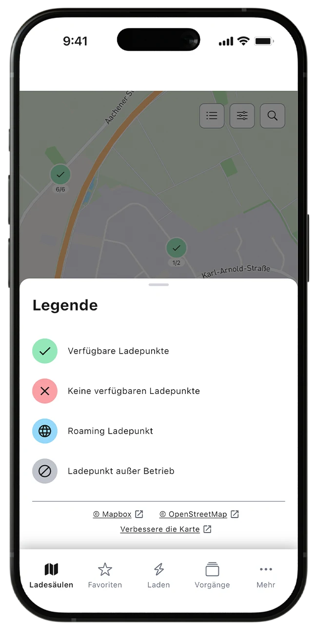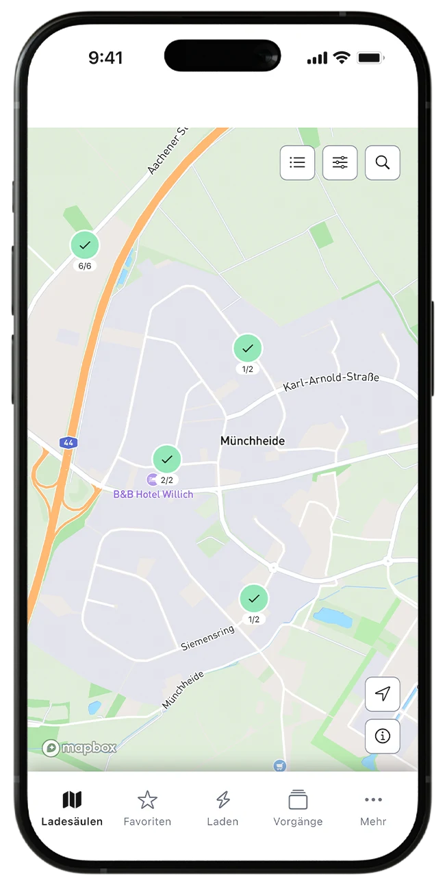 Hier finden Sie Ladesäulen, starten Ladevorgänge und behalten Ihre Kosten im Blick.